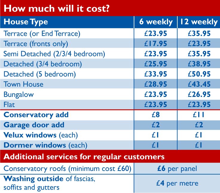 - Prices assume there is nothing unusual in your house's design, e.g. large areas of glass, large bay windows, extensions, etc.